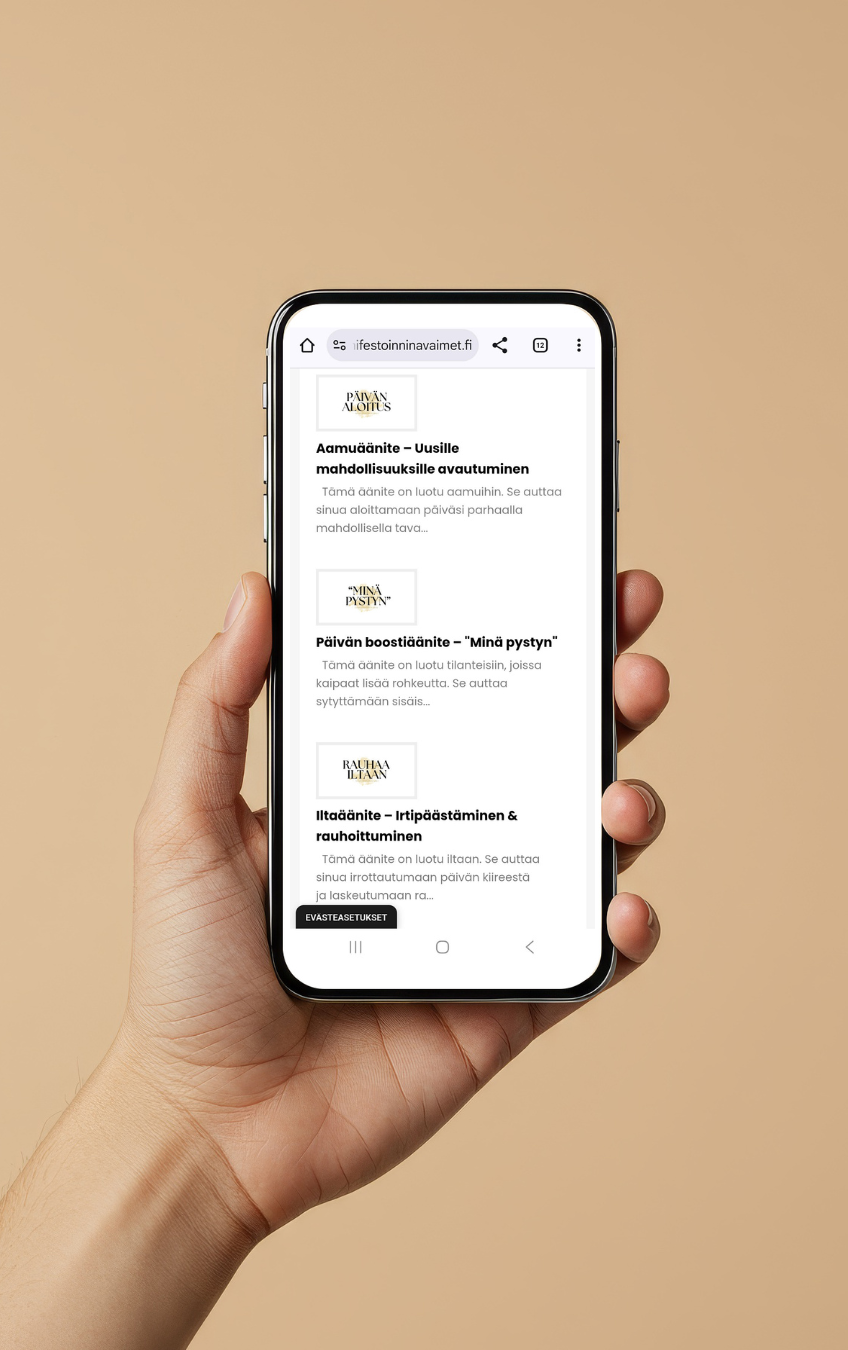 Lukuisten videoiden lisäksi saat pääsyn Manifestoijan Mindset-äänitekirjastoon, joka tukee edistymistäsi manifestoinnissa arjen eri hetkissä!