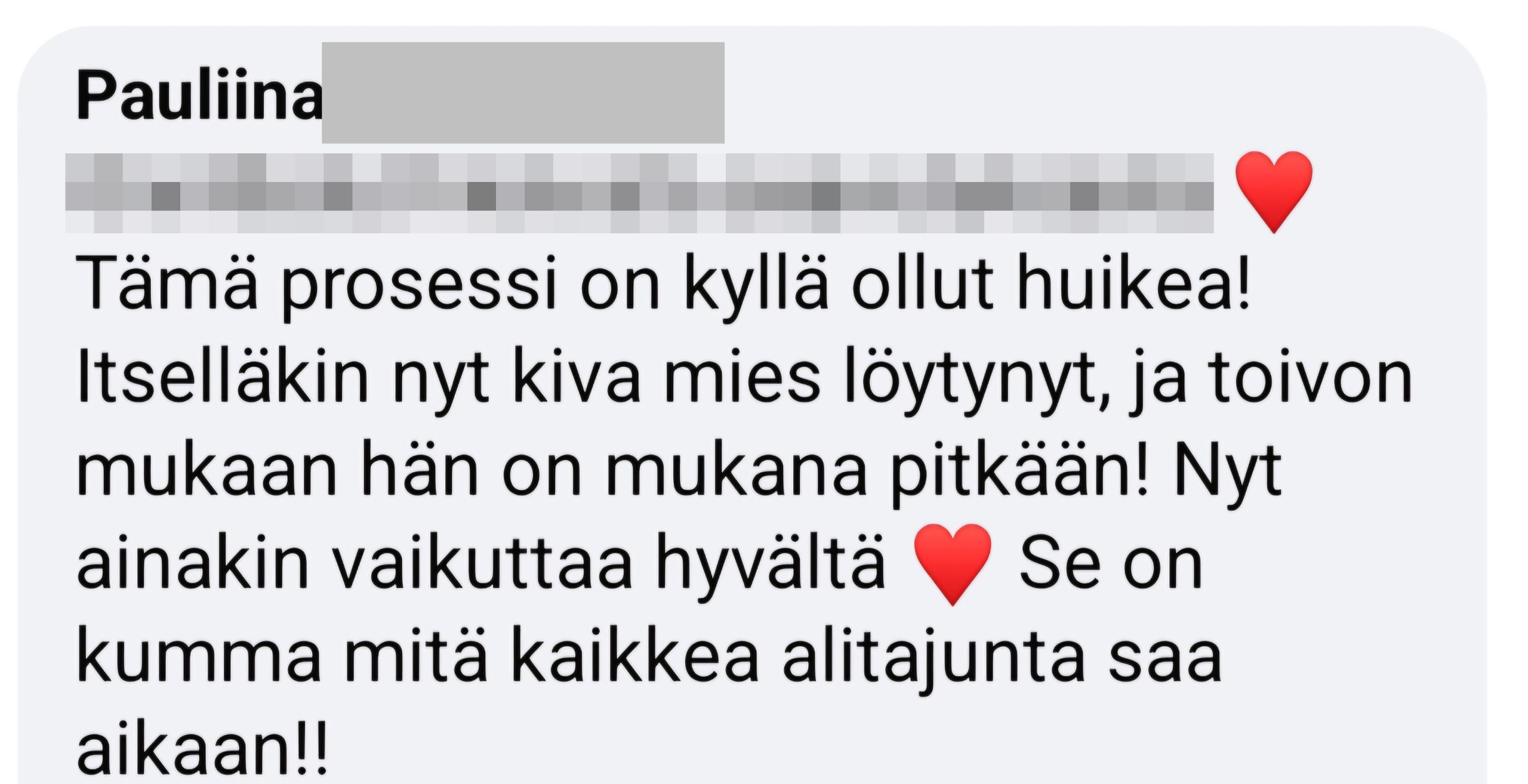 Onnistuin manifestoimaan täysin haaveilemani kaltaisen kumppanin ja juuri sellaisen parisuhteen, josta olin aina unelmoinut. Sen lisäksi manifestointi auttoi muuttamaan taloudellisen tilanteeni täysin!