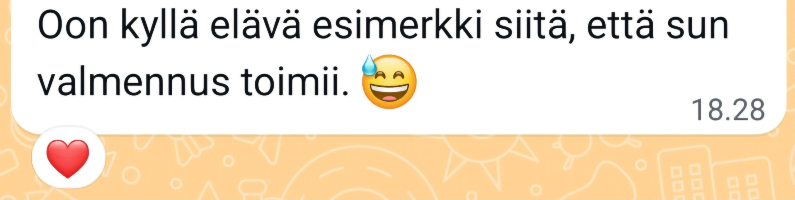 Tälle ymmärrykselle Manifestoinnin Avaimet™ -kurssi on rakennettu. Olen ainoa Suomessa, joka yhdistää manifestoinnin selkeästi aivojen toimintaan ja tiedostamattoman mielen malleihin – tavalla, joka ei kaadu ensimmäiseen vastoinkäymiseen ja kestää arjessa ilman jatkuvaa "oikeaa fiilistä".