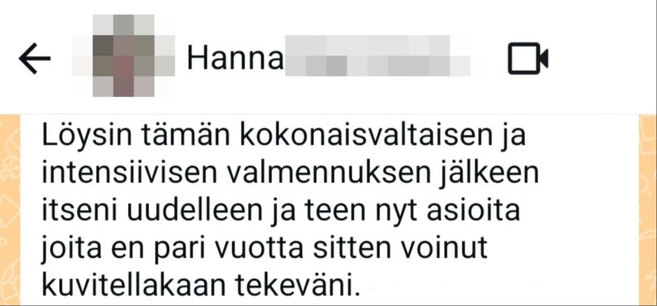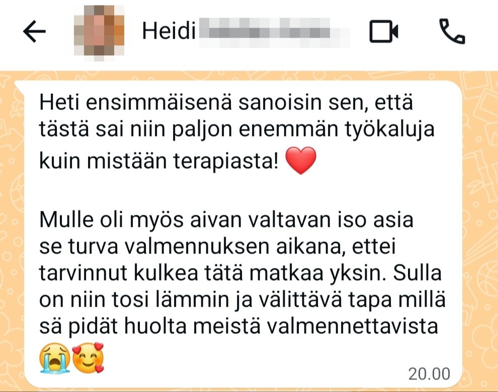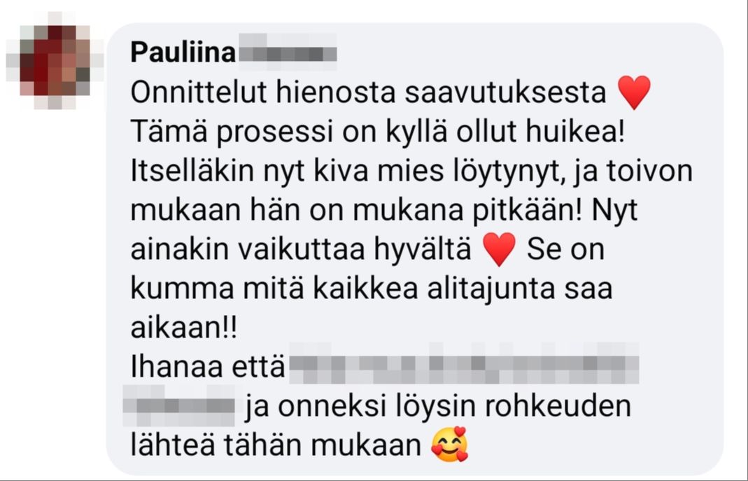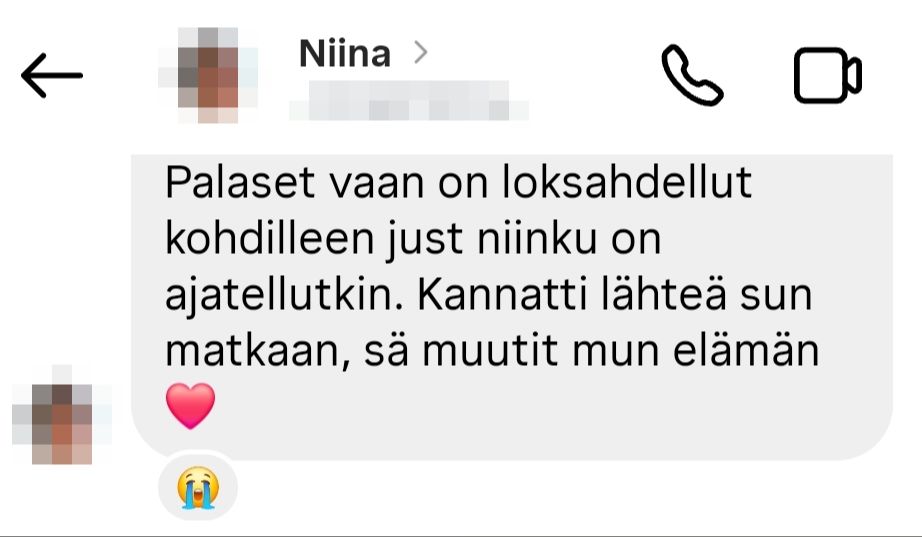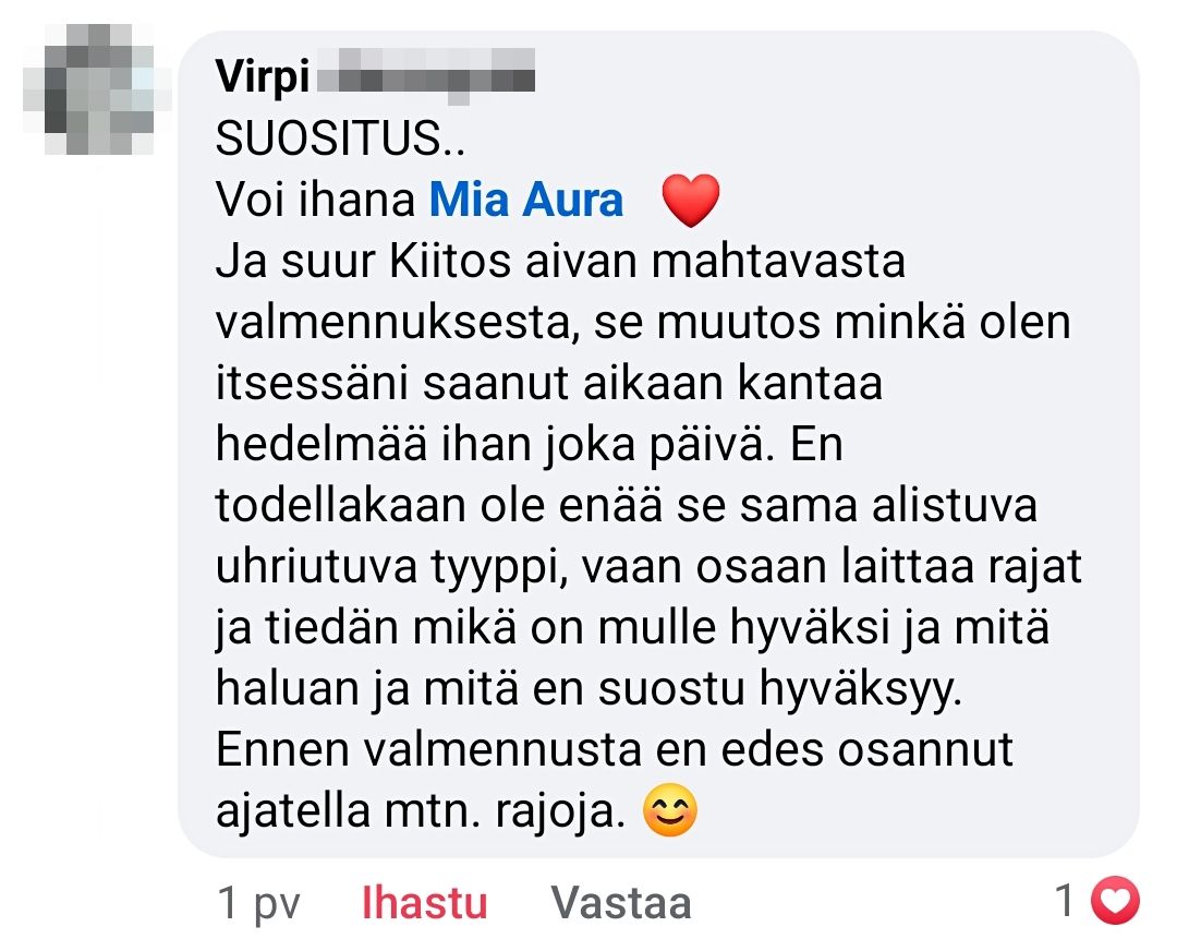 "Ilman valmennusta mikään vanhaan verrattuna ei olisi muuttunut. Istuisin rakkauden kipeänä sohvalla ja selaisin Tinderiä päämäärättömästi ja skeptisenä. Mian tyyli valmentaa oli mulle täydellinen. Käytiin isoja asioita läpi koko ajan hyvällä fiiliksellä! Ihana valmentaja kaikin puolin.